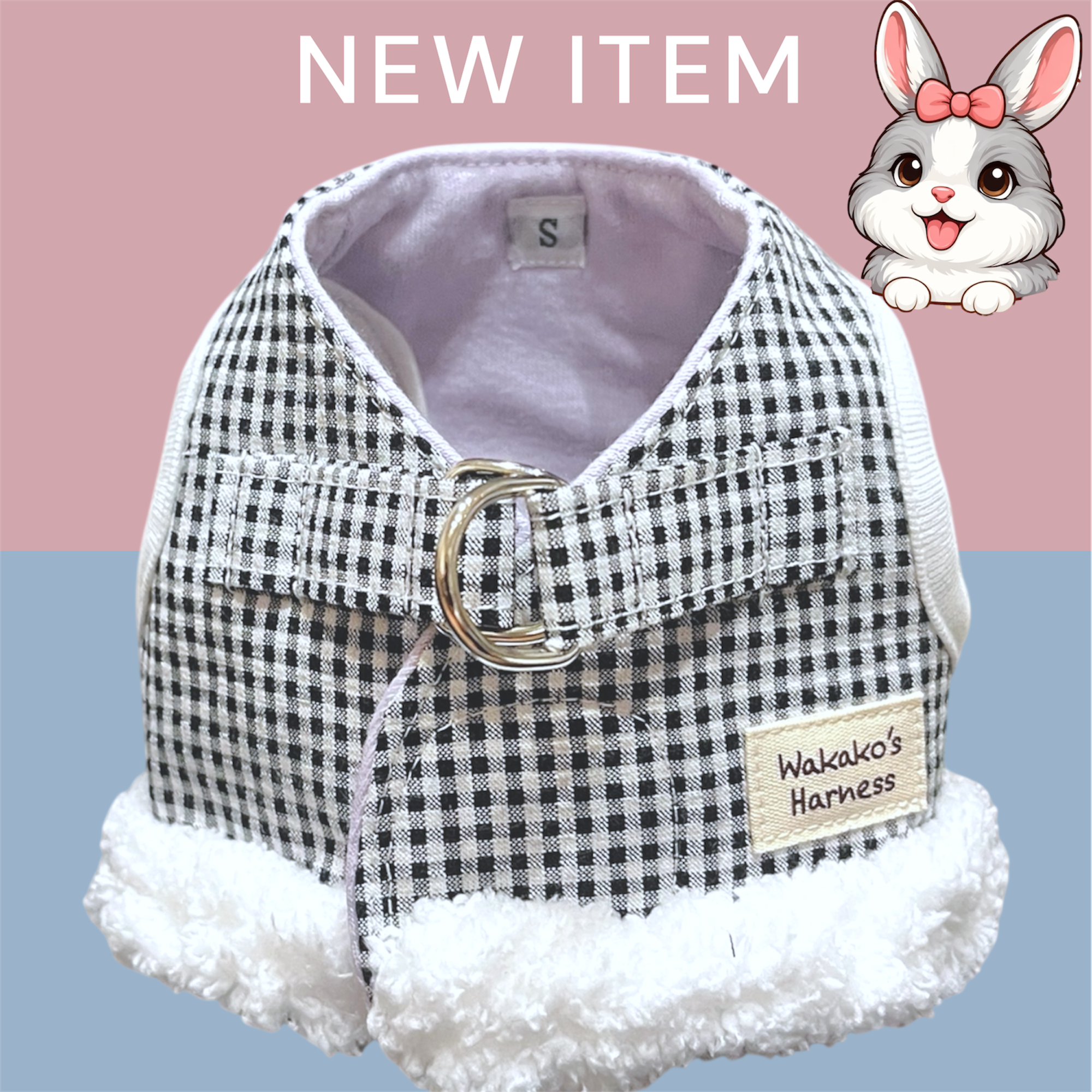 ふわふわのボアを合わせた背中で留めるチョッキタイプのハーネスです。